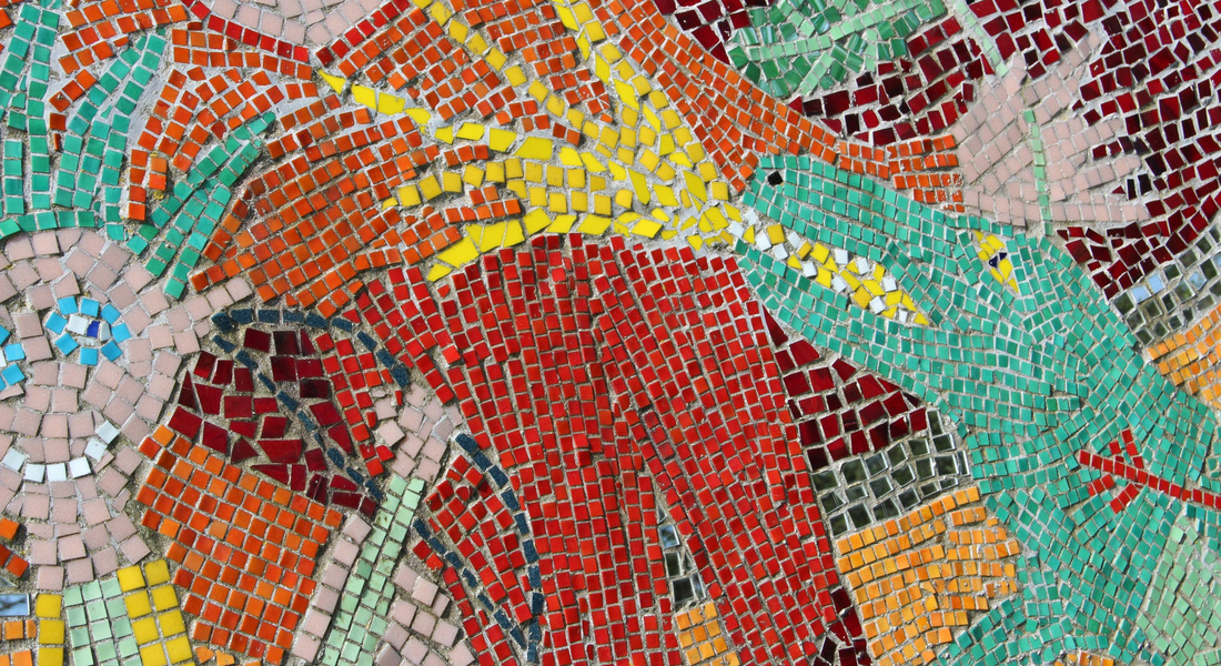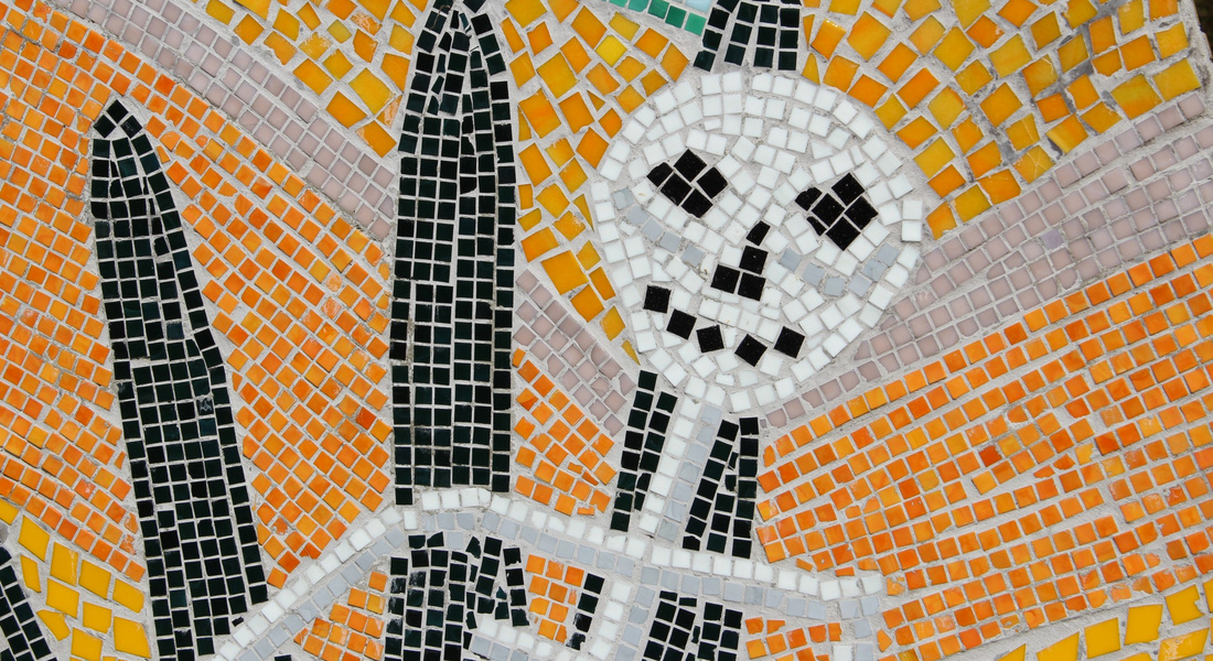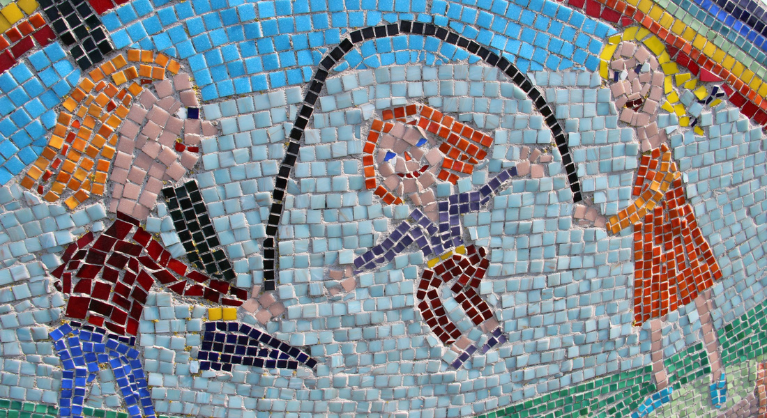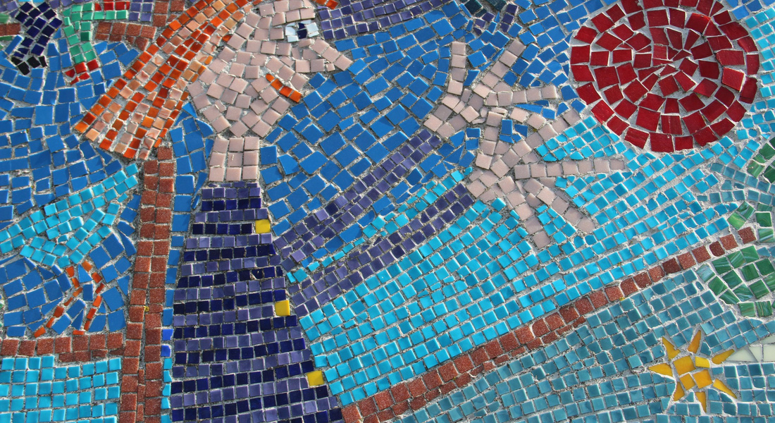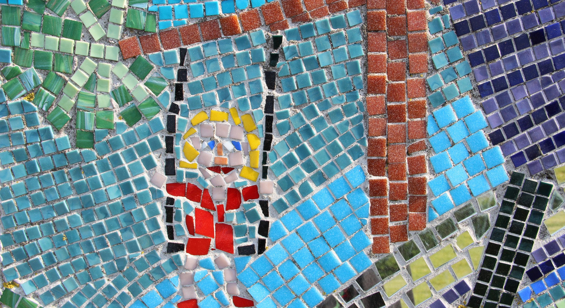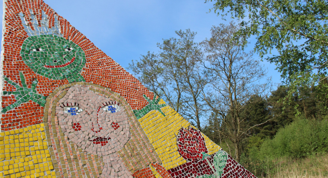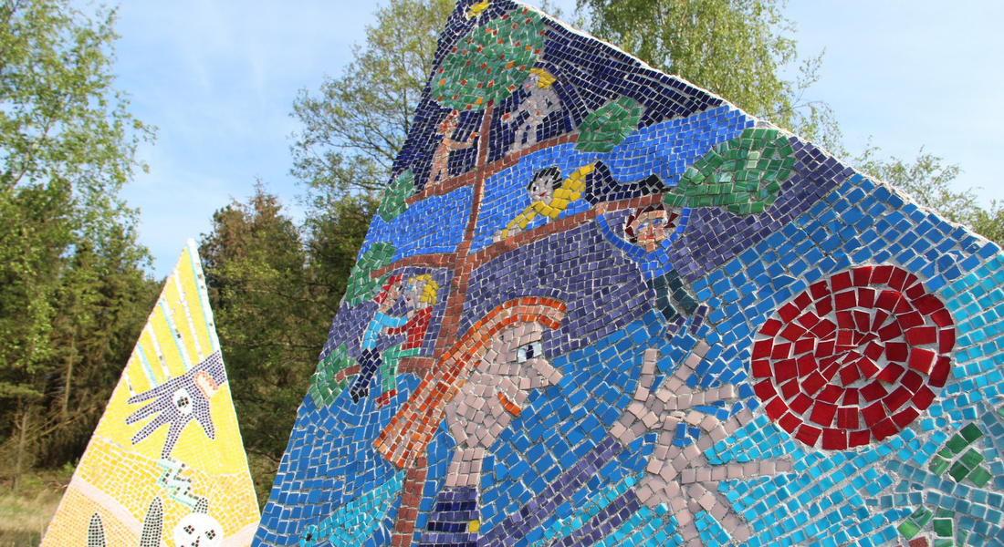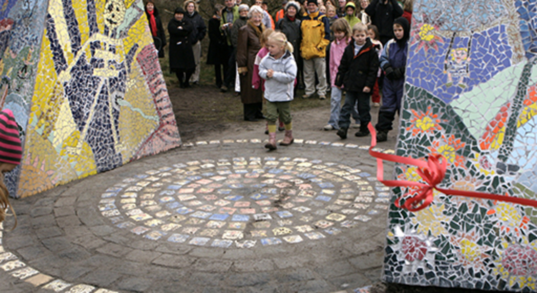 Mellem de to skulpturdele ligger keramiske trædesten, én for hver deltager i værkets tilblivelse, og dekoreret af hver enkelt.