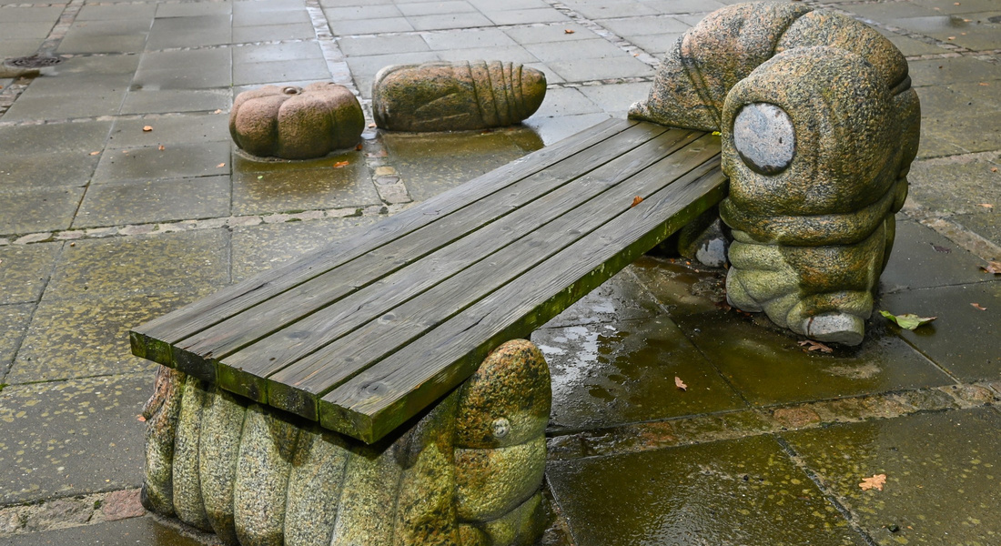larvebænken Niels Aage Schmidt Gave til Billund Centrets 25 års jubilæum. Billund Centret, Hans Jensensvej Granit, 1998