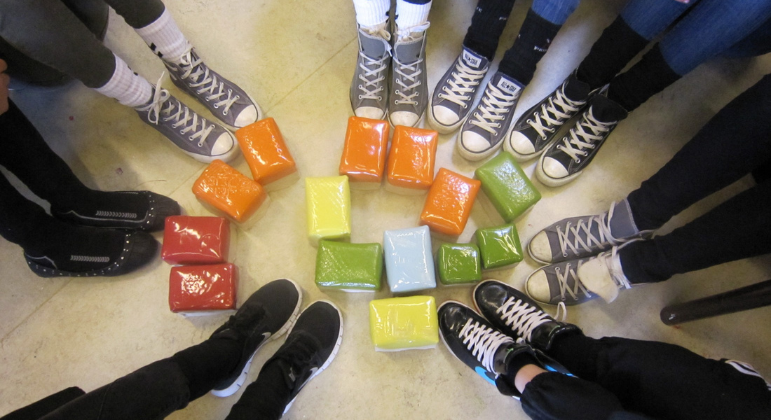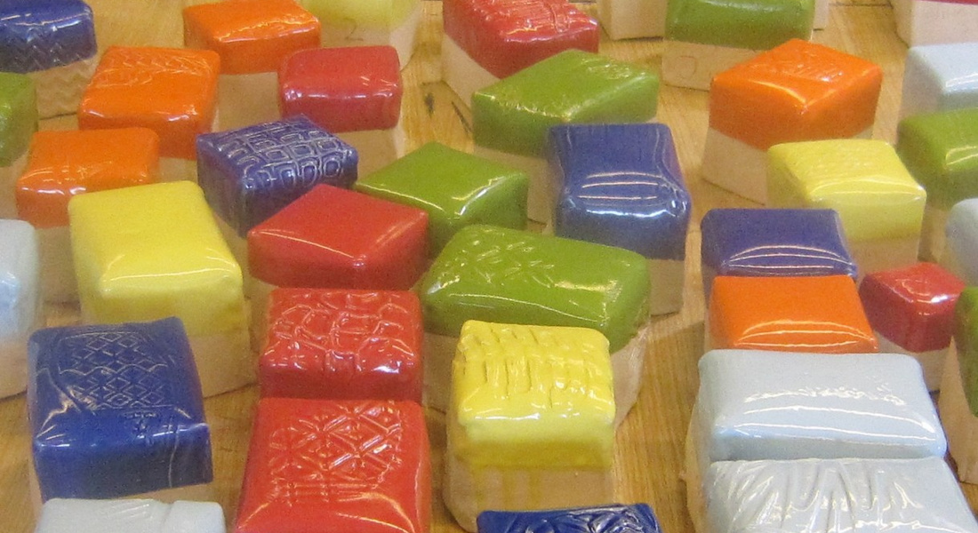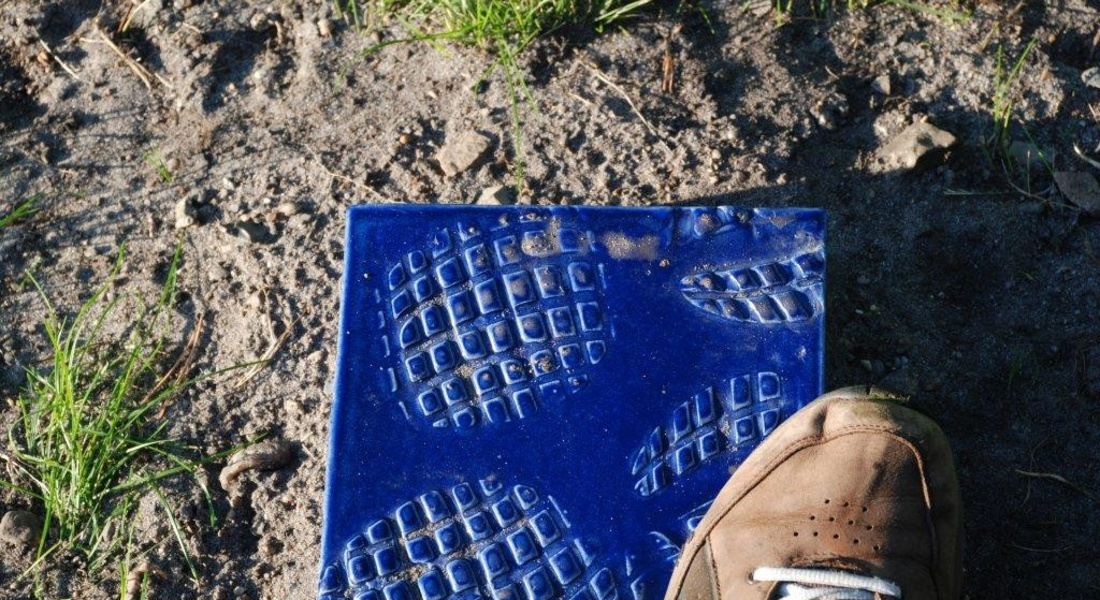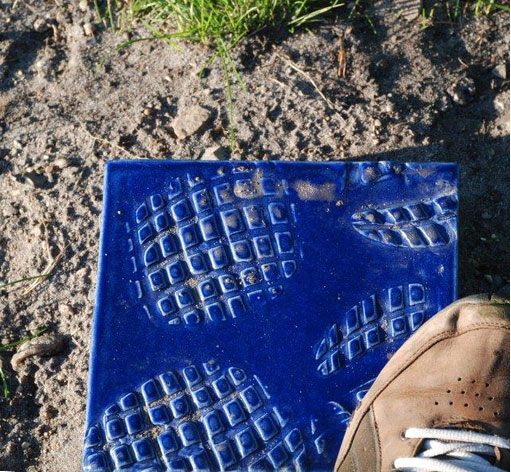 De smukke, blå rutemarkeringssten gennem Skulpturpark Billund er skabt af keramiker Malene Sandal, Kolding. Stenene, der har aftryk af fodspor, viste tidligere vejen på Company Town ruten gennem parken. Uden for parken afløstes de af børnenes fodspor, som blev lavet i et samarbejde mellem Billund Kulturskole og Malene Sandal.