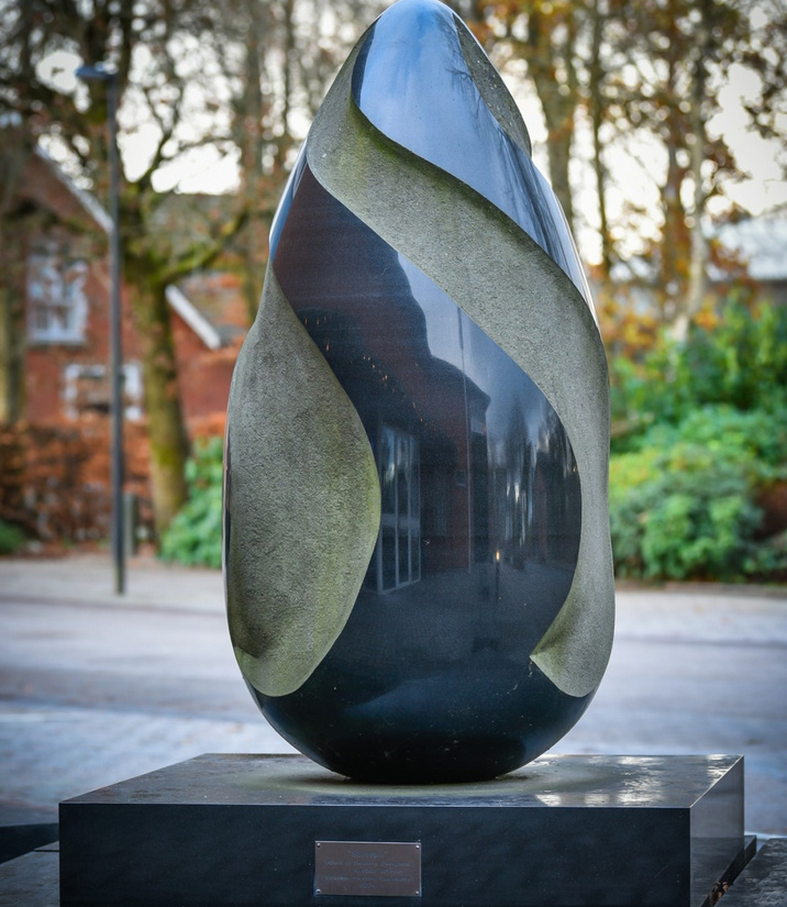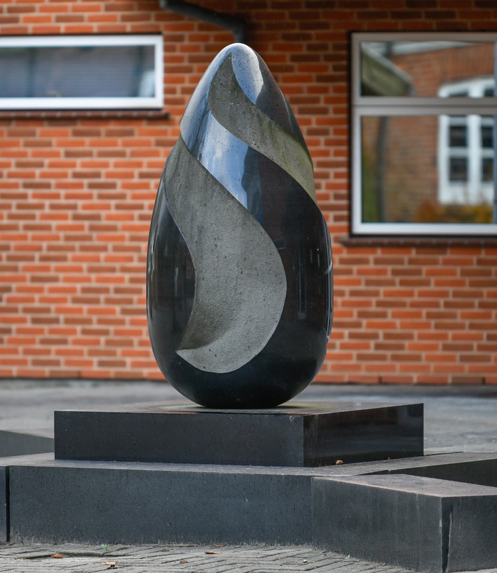 En næsten æggeformet skulptur. Oprindelig opstillet foran Vorbasse Sparekasse - som et svar på Den jyske Sparekasses ”Dråben - Ægget - Universet”.
