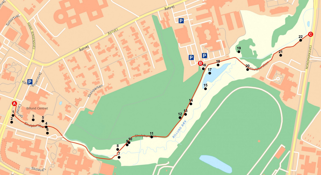 Du kan starte på din 1,3 km vandretur gennem parken ad Skulpturstien ved Nordmarksvej (tæt på LEGOLAND Holiday Village, Hotel Propellen og Lalandia Billund), fra Hans Jensensvej mellem Billund Centret og Skolevej eller ved Billund Bad og Hotel Legoland.