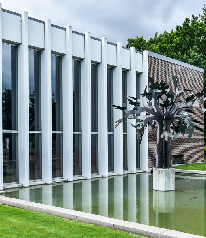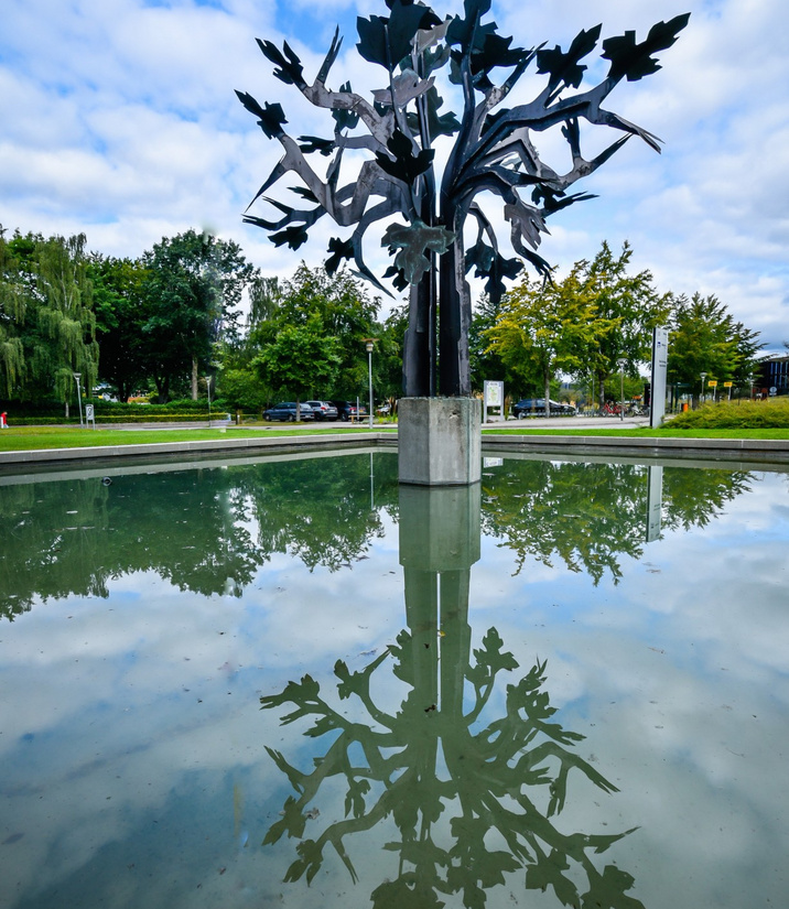 Placeret i spejlbassinet udenfor Billund Centret, Hans Jensensvej.